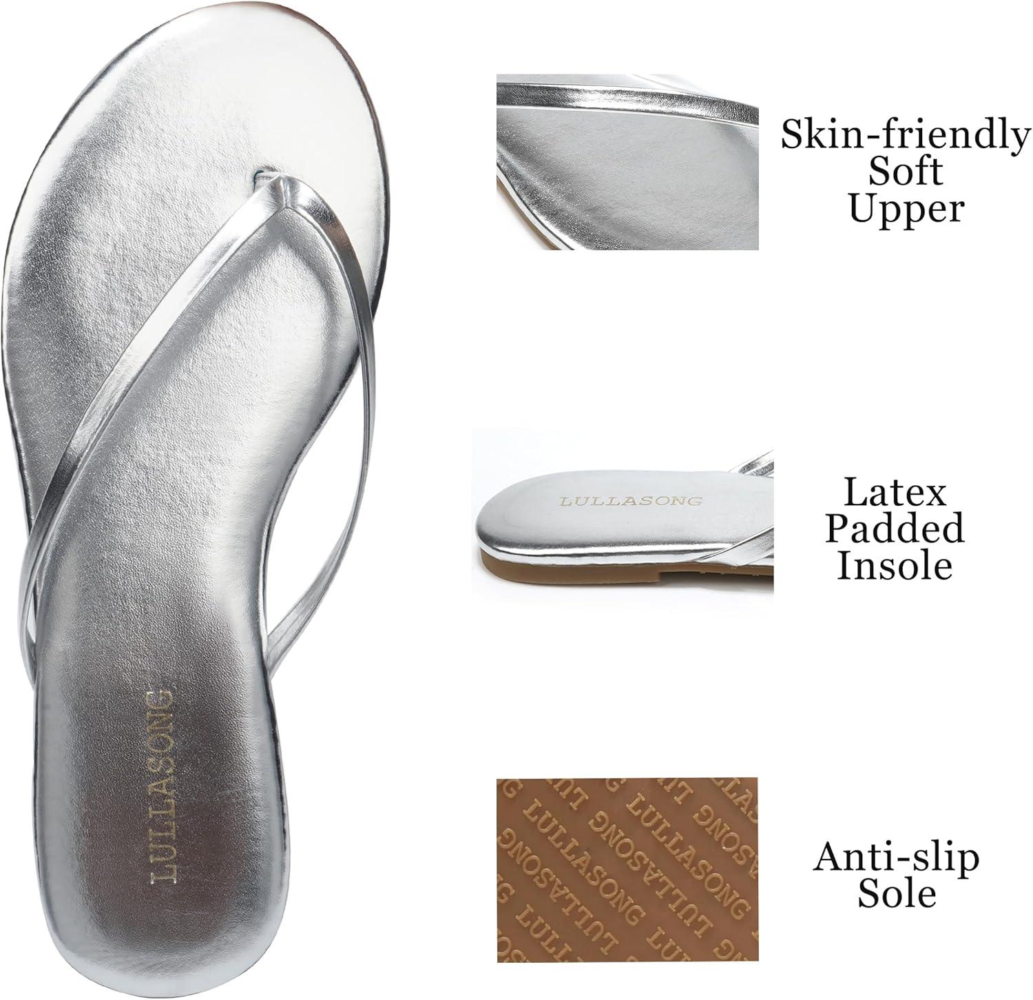 Flip Flops for women are a must-have for every woman, and a pair of slides in silver/black/white/tan/taupe can be worn again and again on many occasions like office/lifestyle/street/shopping/wedding/party/date/beach.LULLASONG flats sandals upper is made of premium faux leather with a lightly padded faux leather insole and an abrasion-resistant rubber outsole to keep you looking comfortable and stylish all day long.The footbed with 5mm thiekened latex provides comfort and shock absorption.