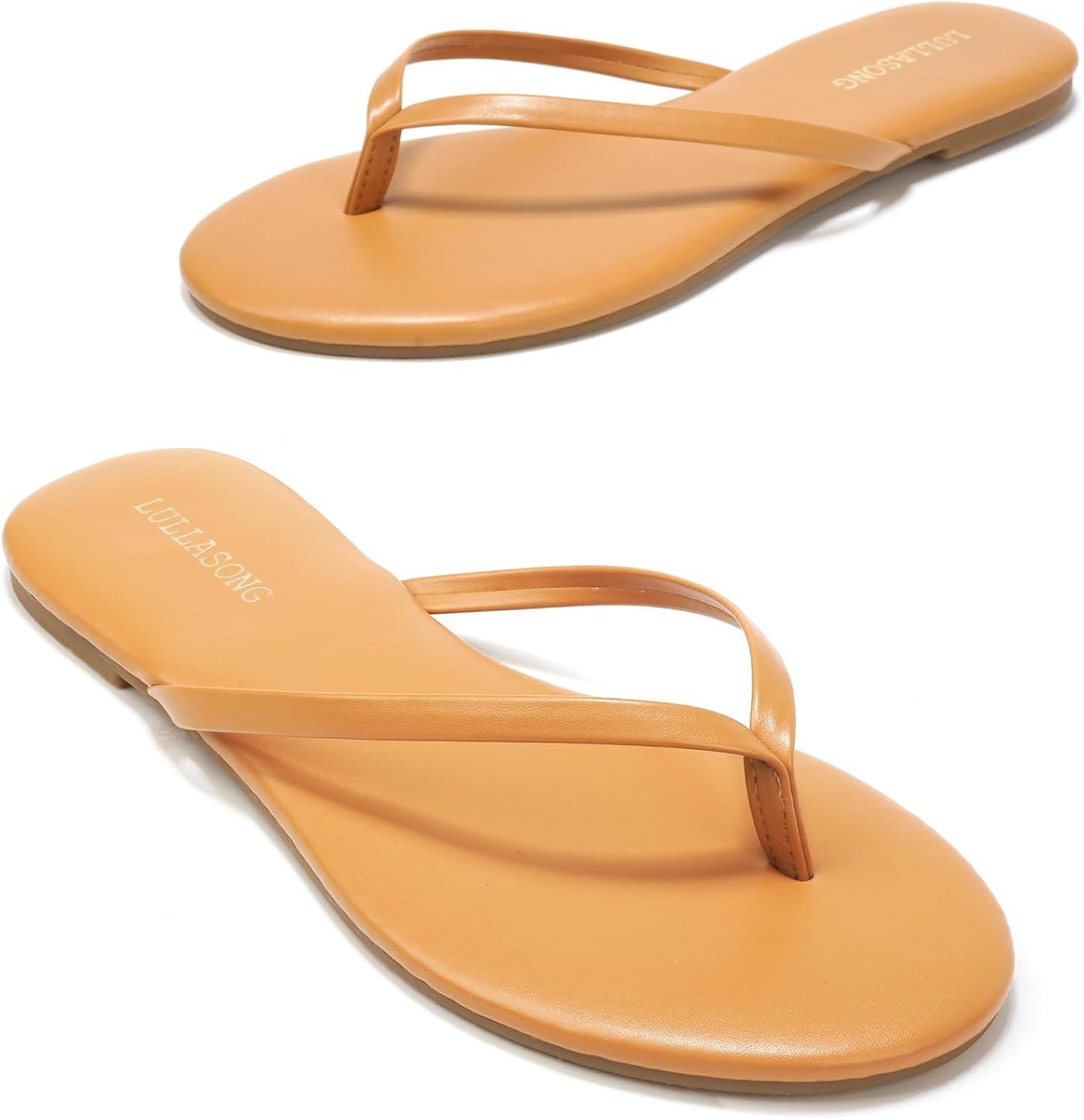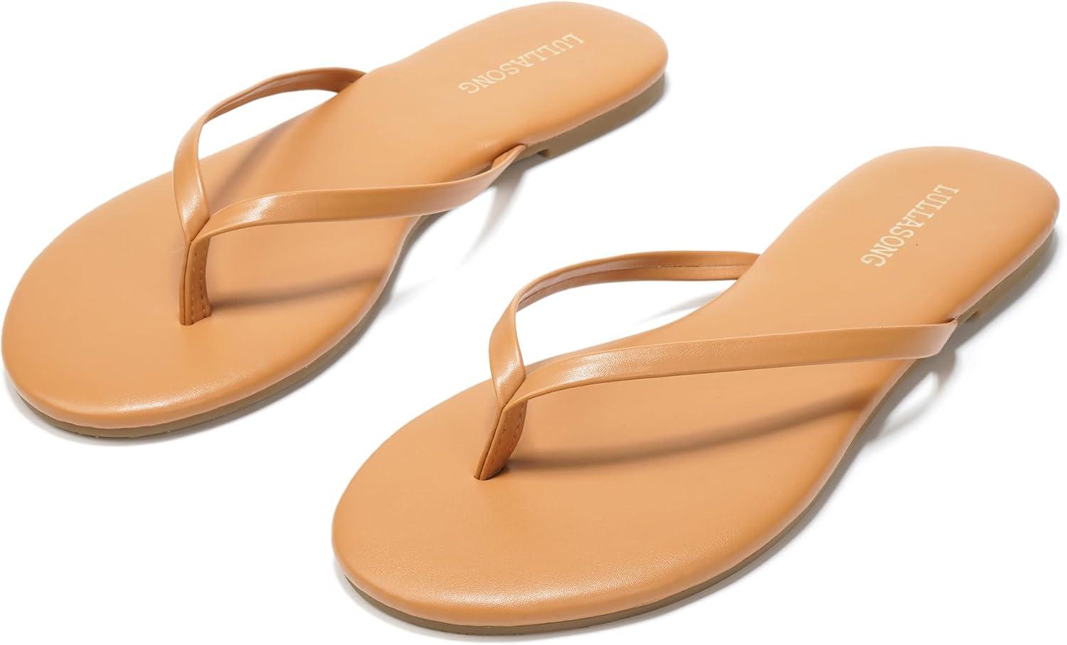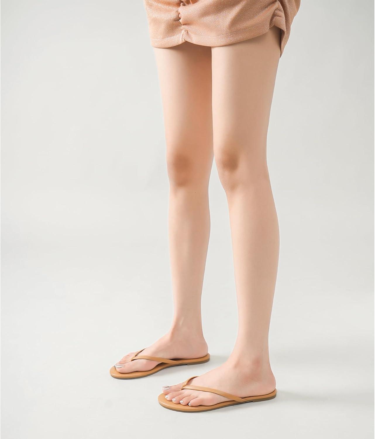 Flip Flops For Women Comfortable Round Toe Beach Sandals Thong Strap Slides Slip On Dressy Flats Sandals For Women(Tan)