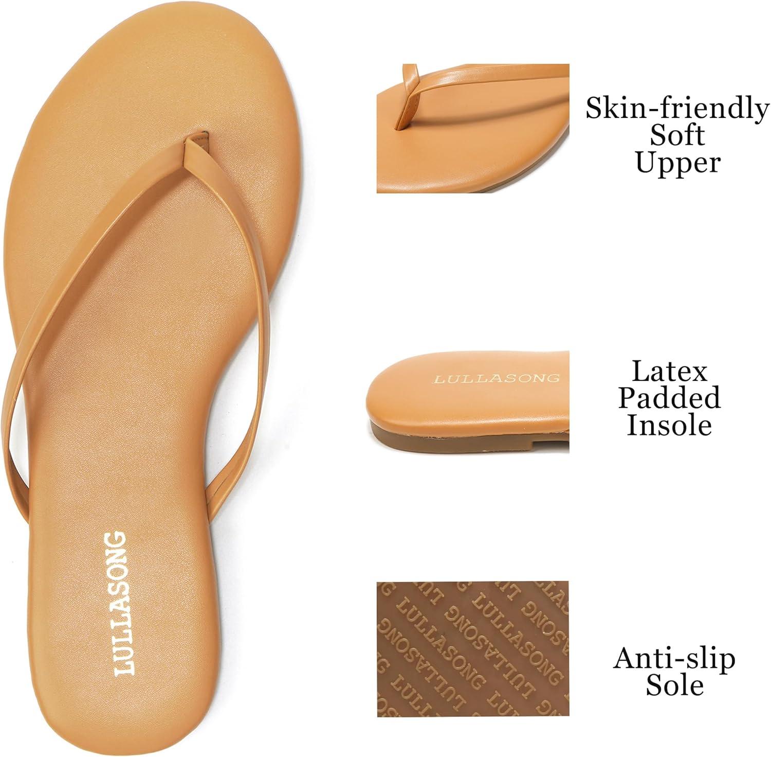 Flip Flops for women are a must-have for every woman, and a pair of slides in silver/black/white/tan/taupe can be worn again and again on many occasions like office/lifestyle/street/shopping/wedding/party/date/beach.LULLASONG flats sandals upper is made of premium faux leather with a lightly padded faux leather insole and an abrasion-resistant rubber outsole to keep you looking comfortable and stylish all day long.The footbed with 5mm thiekened latex provides comfort and shock absorption.
