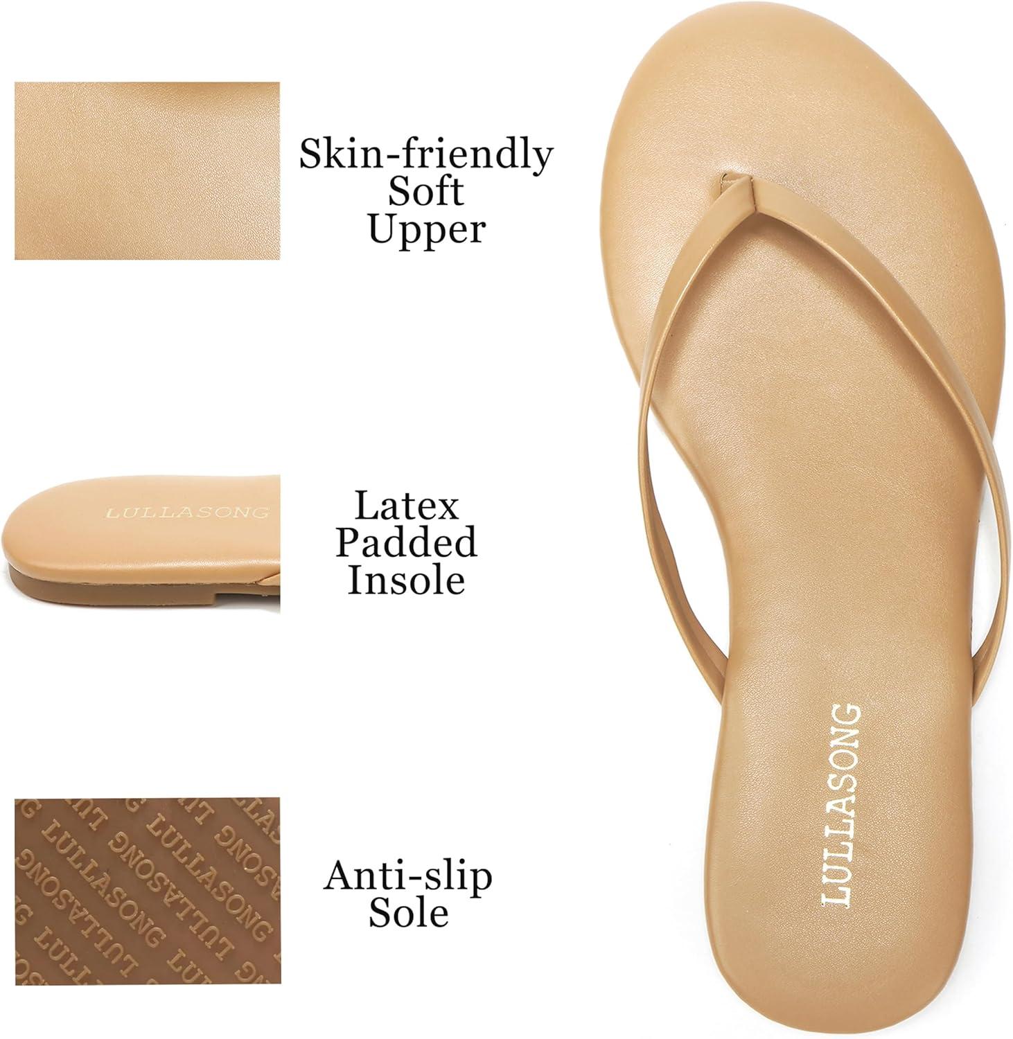 Flip Flops for women are a must-have for every woman, and a pair of slides in silver/black/white/tan/taupe can be worn again and again on many occasions like office/lifestyle/street/shopping/wedding/party/date/beach.LULLASONG flats sandals upper is made of premium faux leather with a lightly padded faux leather insole and an abrasion-resistant rubber outsole to keep you looking comfortable and stylish all day long.The footbed with 5mm thiekened latex provides comfort and shock absorption.